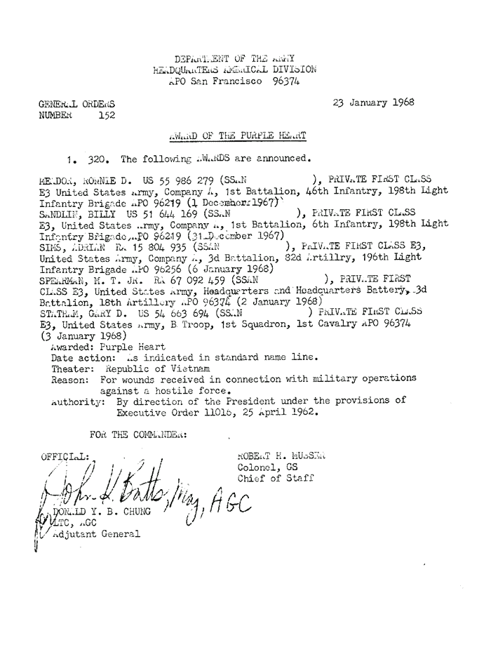 | Blunt | Marvin | A | SP4 | BS | A/1/6 | Feb-69 | 69-0068 | 1969 Order |