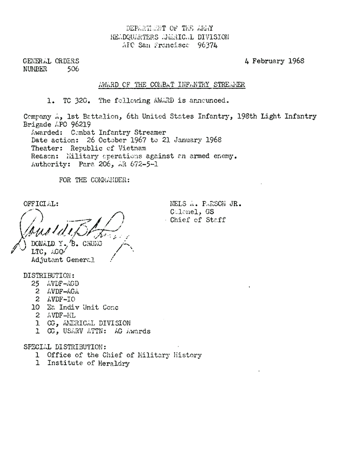 | A/1/6 | Combat Inf. Streamer | A/1/6 | 21-Jan-68 | AD-68-0506 | ||||