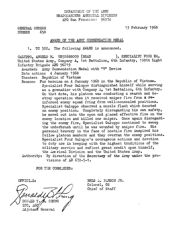 | Galuppo | Angelo | M | SP4 | ACM w/V | A/1/6 | 4-Jan-68 | AD-68-0658 | |