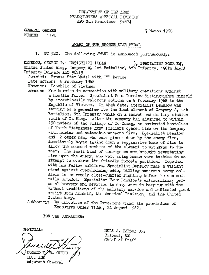 | Denslow | George | R | SP4 | BS w/V | A/1/6 | 8-Feb-68 | AD-68-1190 | Posthumously |