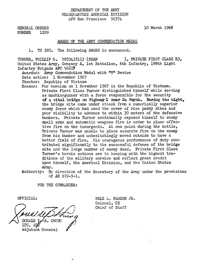 | Turner | Phillip | G | PFC | ACM w/V | A/1/6 | 1-Nov-67 | AD-68-1229 | |