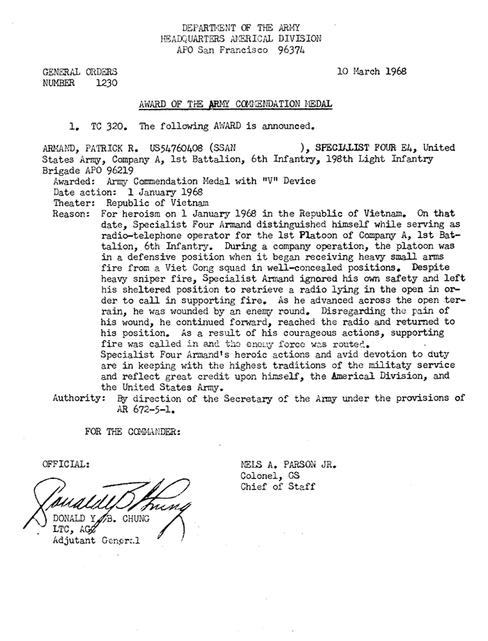 | Armand | Patrick | R | SP4 | ACM w/V | A/1/6 | 1-Jan-68 | AD-68-1230 | |