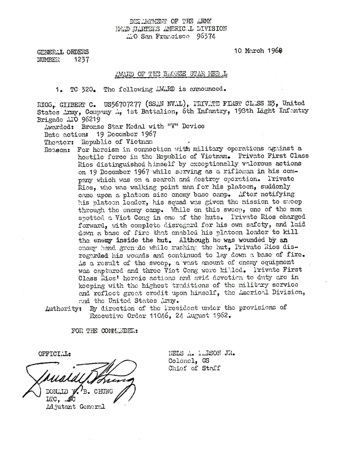 | Rios | Gilbert | C | PFC | BS w/V | A/1/6 | 19-Dec-67 | AD-68-1237 | |