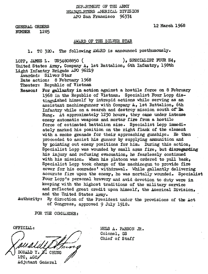 | Gonzalez | Ramon | H | SSG | SS | A/1/6 | 8-Feb-68 | AD-68-1862 | Posthumously |