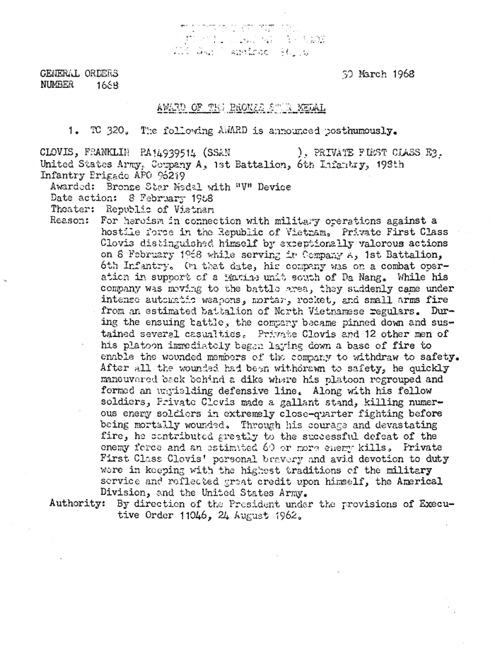 | Clovis | Franklin | PFC | BS w/V | A/1/6 | 8-Feb-68 | AD-68-1668 | Posthumously | |
