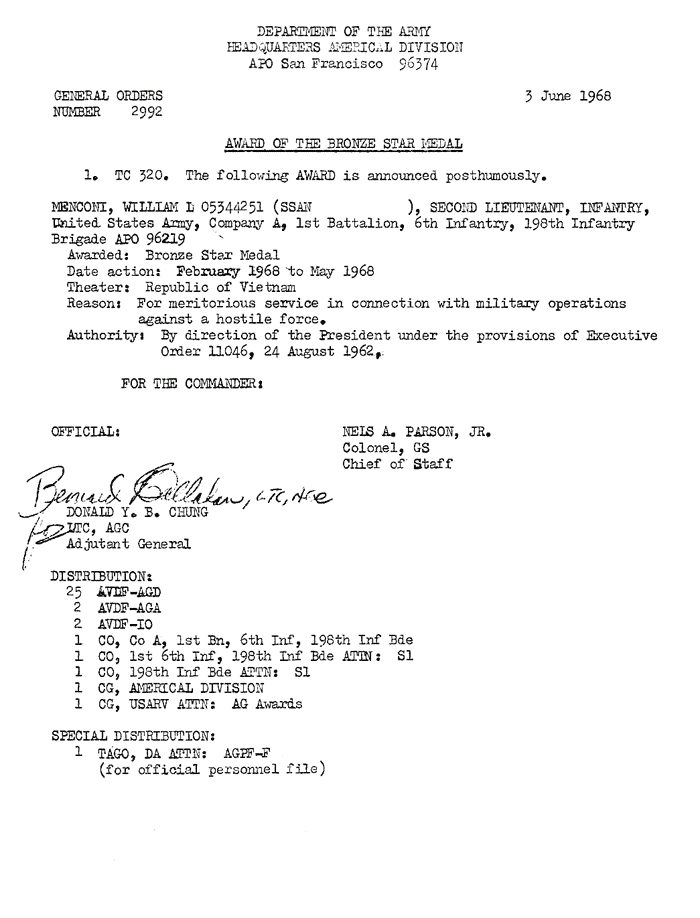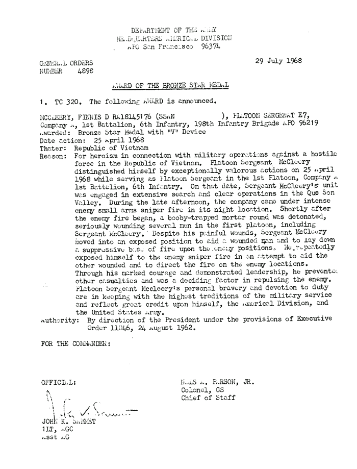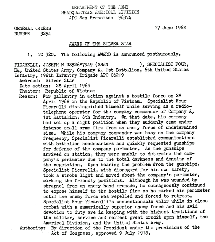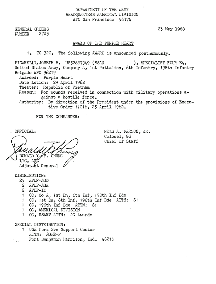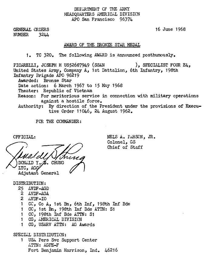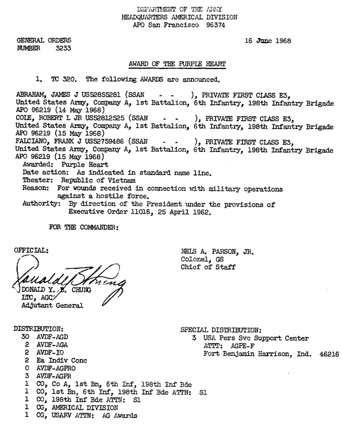 | Falciano | Frank | J | PFC | BS w/V | A/1/6 | 30-May-68 | 69-0034 | 1969 Order |