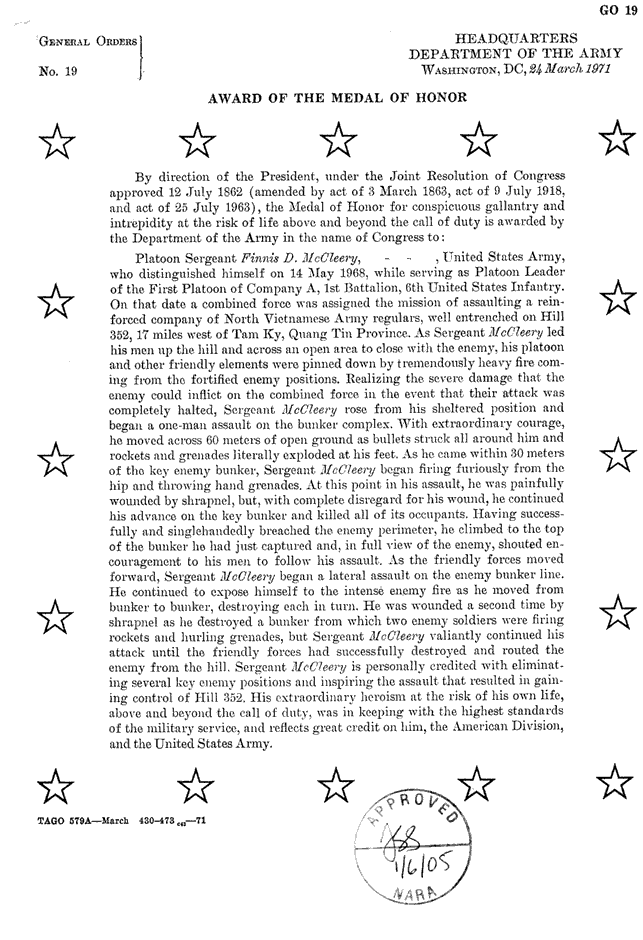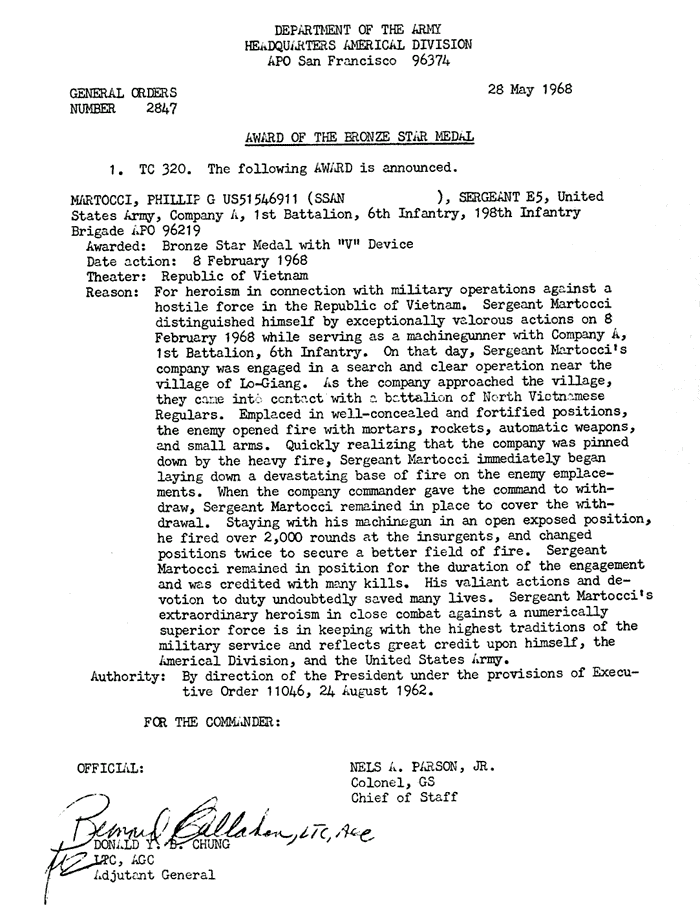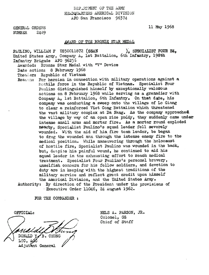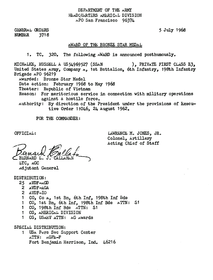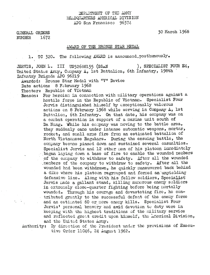 | Falciano | Frank | J | PFC | BS w/V | A/1/6 | 30-May-68 | 69-0034 | 1969 Order |
