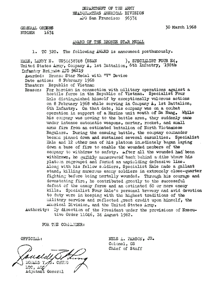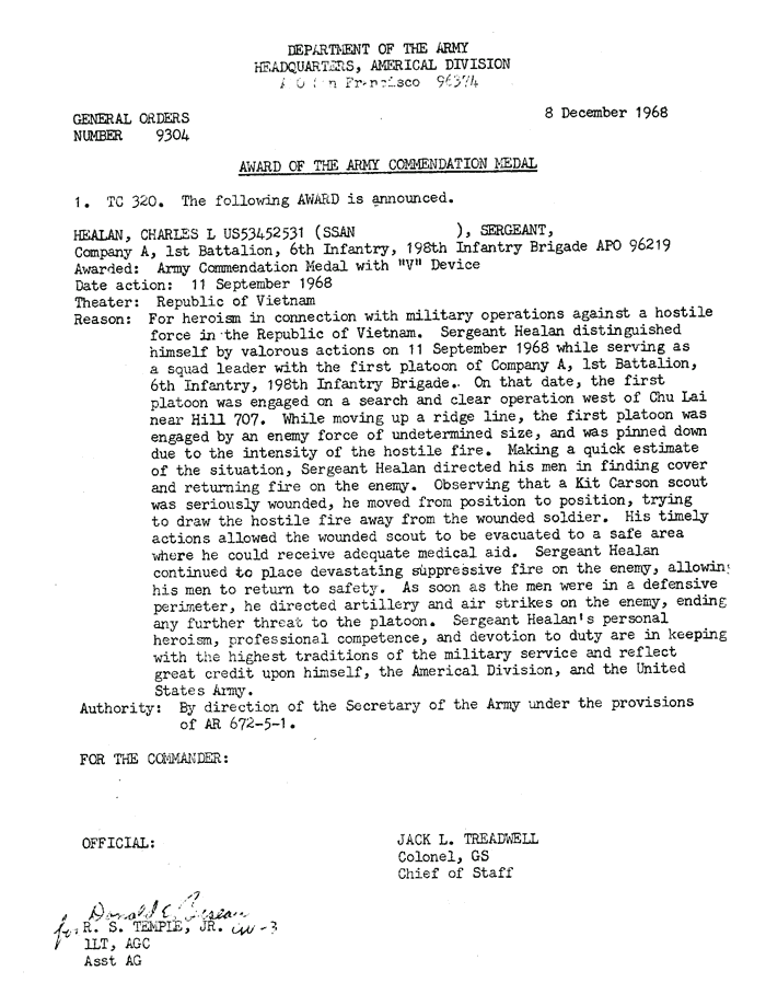 | Rawlings | Loyal | D | SGT | BS | A/1/6 | Feb-69 | 69-0068 | 1969 Order |