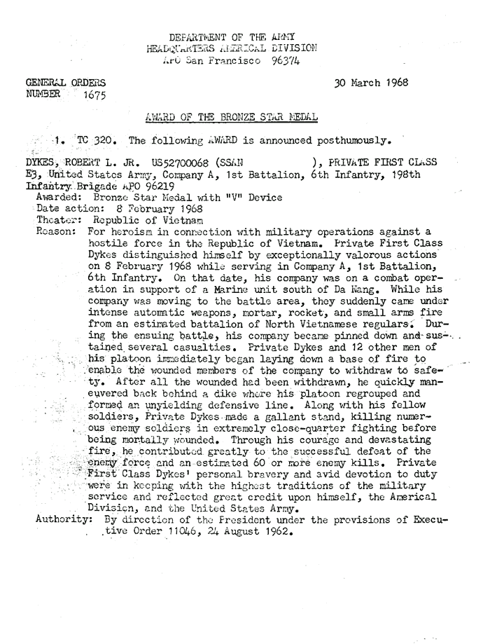 | Dykes | Robert | L | PFC | BS w/V | A/1/6 | 8-Feb-68 | AD-68-1675 | Posthumously |