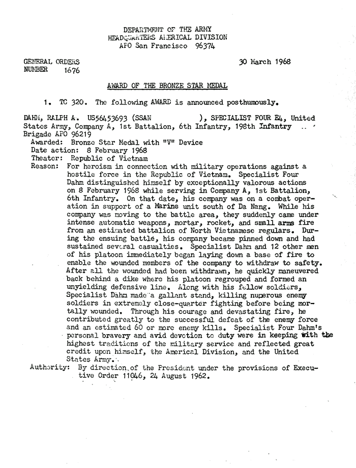 | Dahm | Ralph | A | SP4 | BS w/V | A/1/6 | 8-Feb-68 | AD-68-1676 | Posthumously |