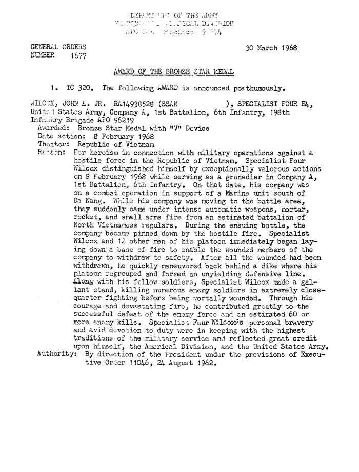 | Wilcox | John | A | SP4 | BS w/V | A/1/6 | 8-Feb-68 | AD-68-1677 | Posthumously |
