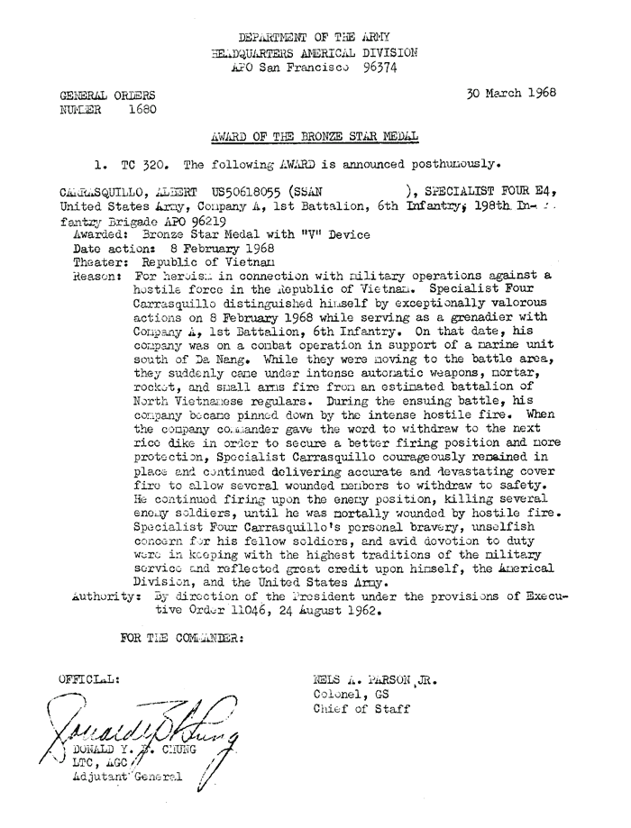 | Carrasquillo | Albert | SP4 | BS w/V | A/1/6 | 8-Feb-68 | AD-68-1680 | Posthumously | |