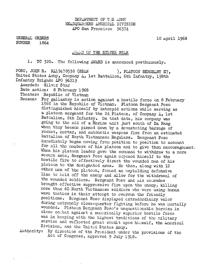 | Poso | John | R | SFC | SS | A/1/6 | 8-Feb-68 | AD-68-1864 | Posthumously |