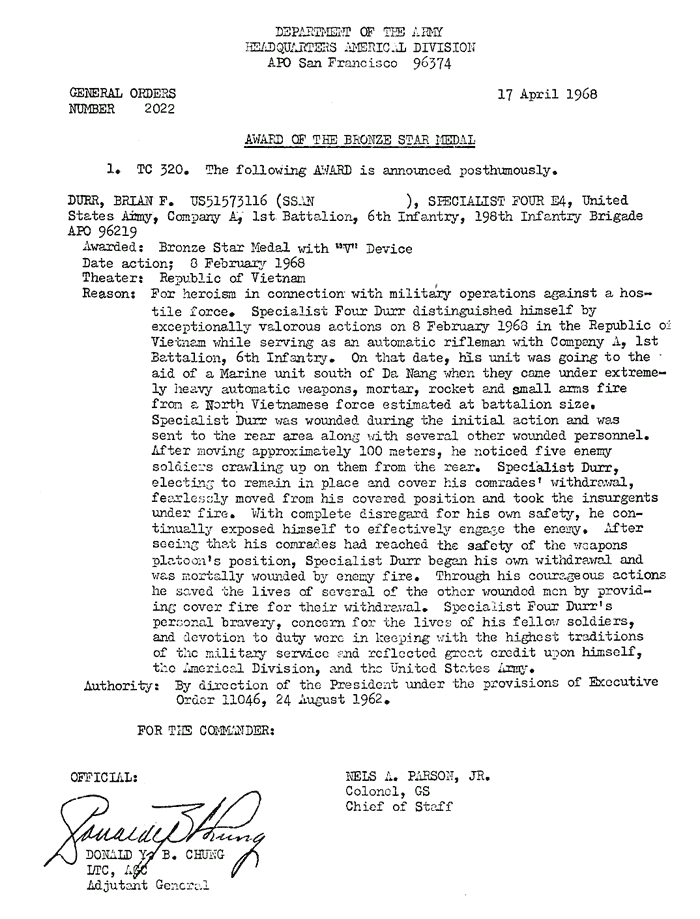| Durr | Brian | F | SP4 | BS w/V | A/1/6 | 8-Feb-68 | AD-68-2022 | Posthumously |