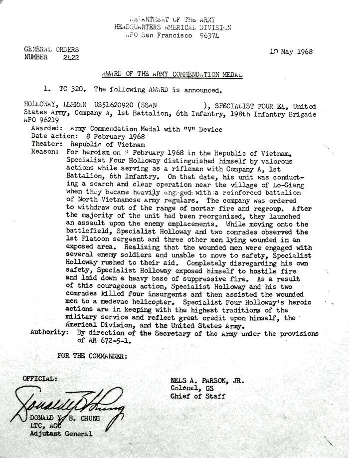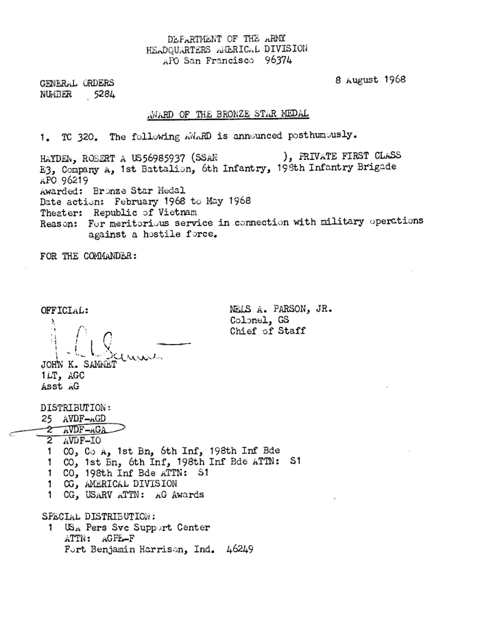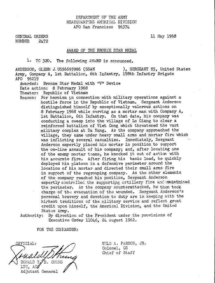 | Anderson | Glenn | J | SGT | BS w/V | A/1/6 | 8-Feb-68 | AD-68-2472 | |