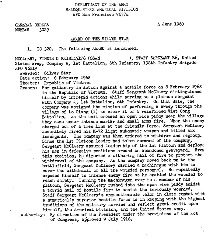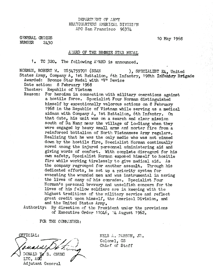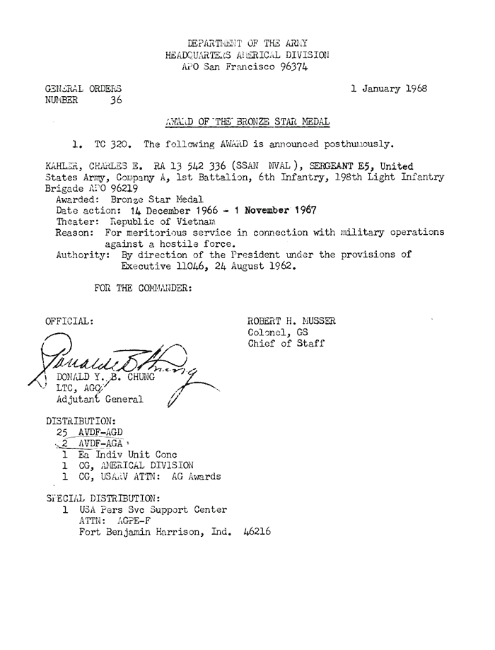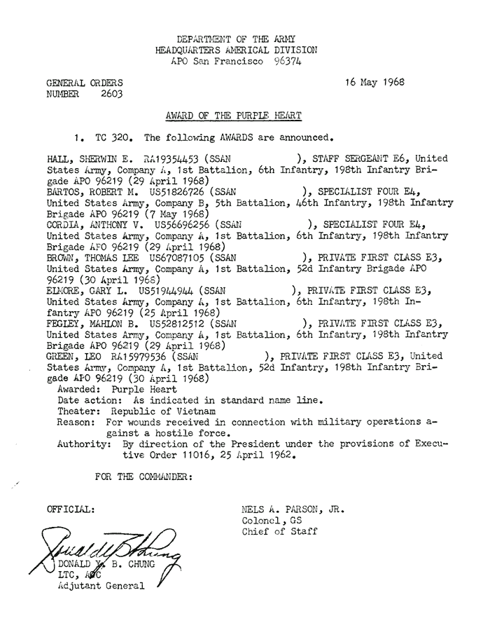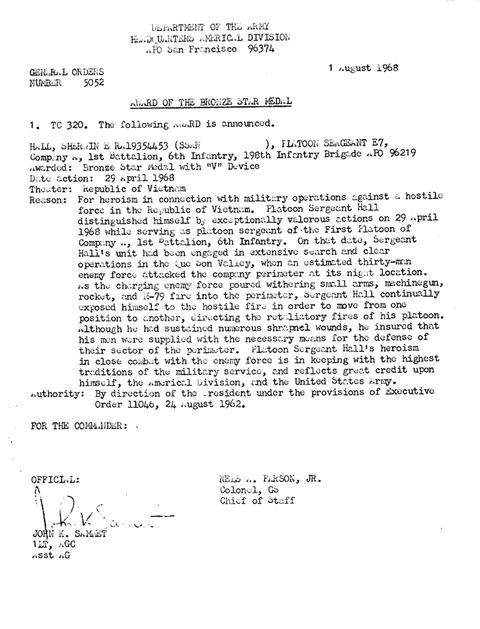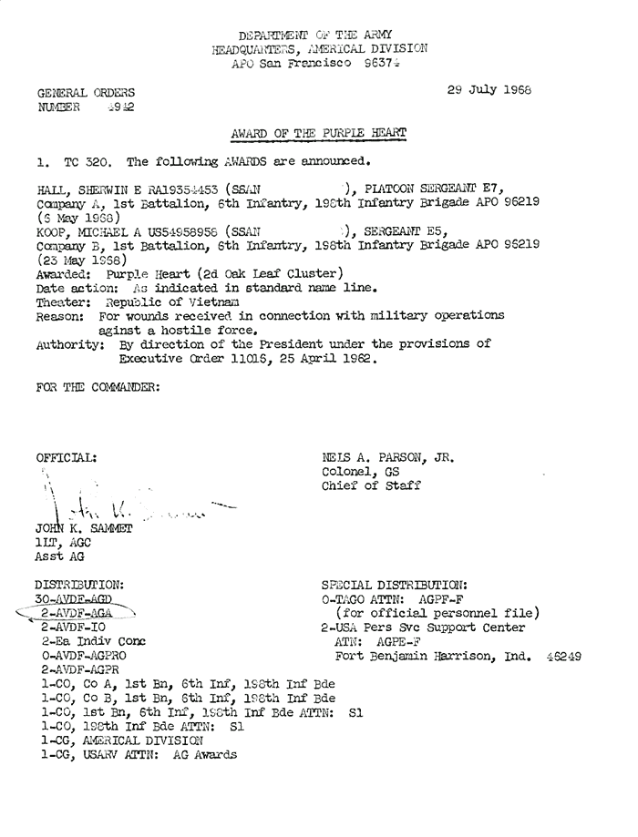 | Ward | Carl | A | SGT | BS | A/1/6 | Feb-69 | 69-0068 | 1969 Order |