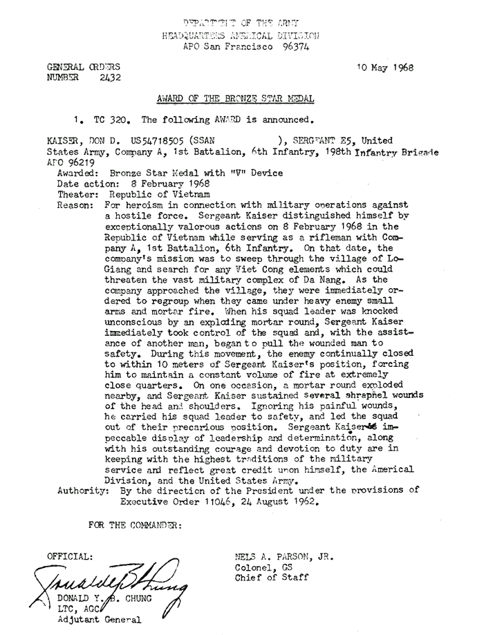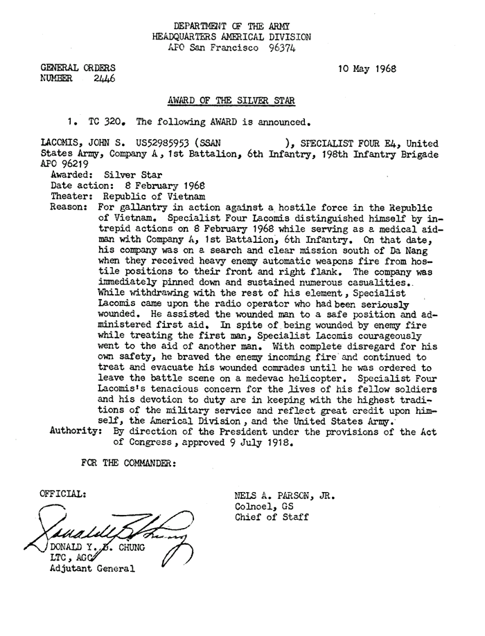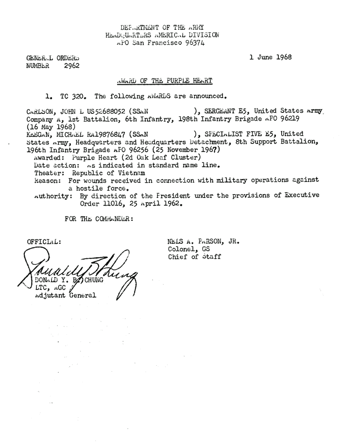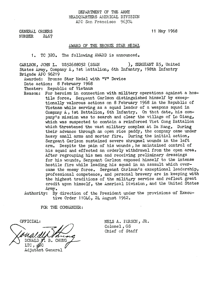 | Carlson | John | L | SGT | BS w/V | A/1/6 | 8-Feb-68 | AD-68-2467 | |