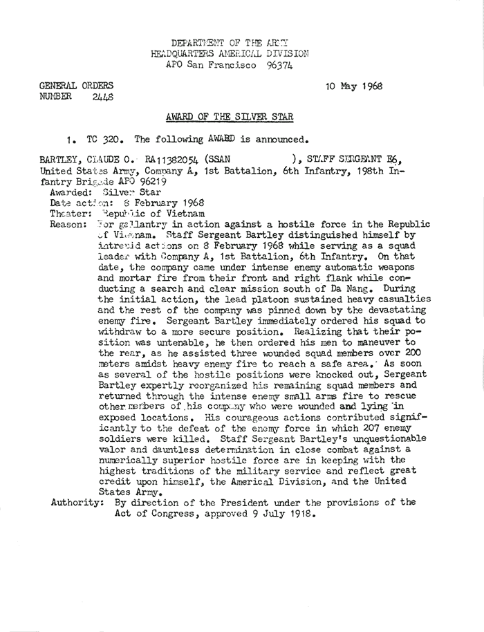 | Bartley | Claude | O | SSG | SS | A/1/6 | 8-Feb-68 | AD-68-2448 | |