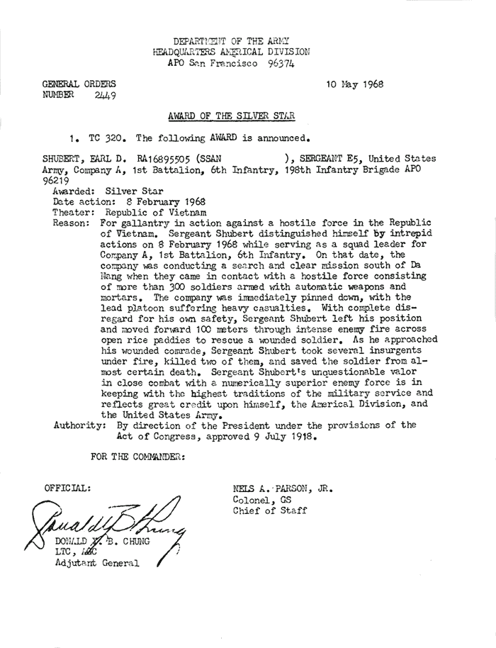 | Shubert | Earl | D | SGT | SS | A/1/6 | 8-Feb-68 | AD-68-2449 | |