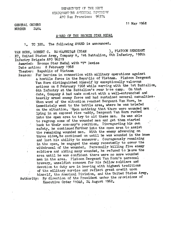 | Van Horn | Robert | C | SFC | BS w/V | A/1/6 | 8-Feb-68 | AD-68-2464 | |