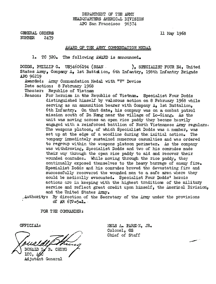 | Dodds | Philip | G | SP4 | ACM w/V | A/1/6 | 8-Feb-68 | AD-68-2479 | |