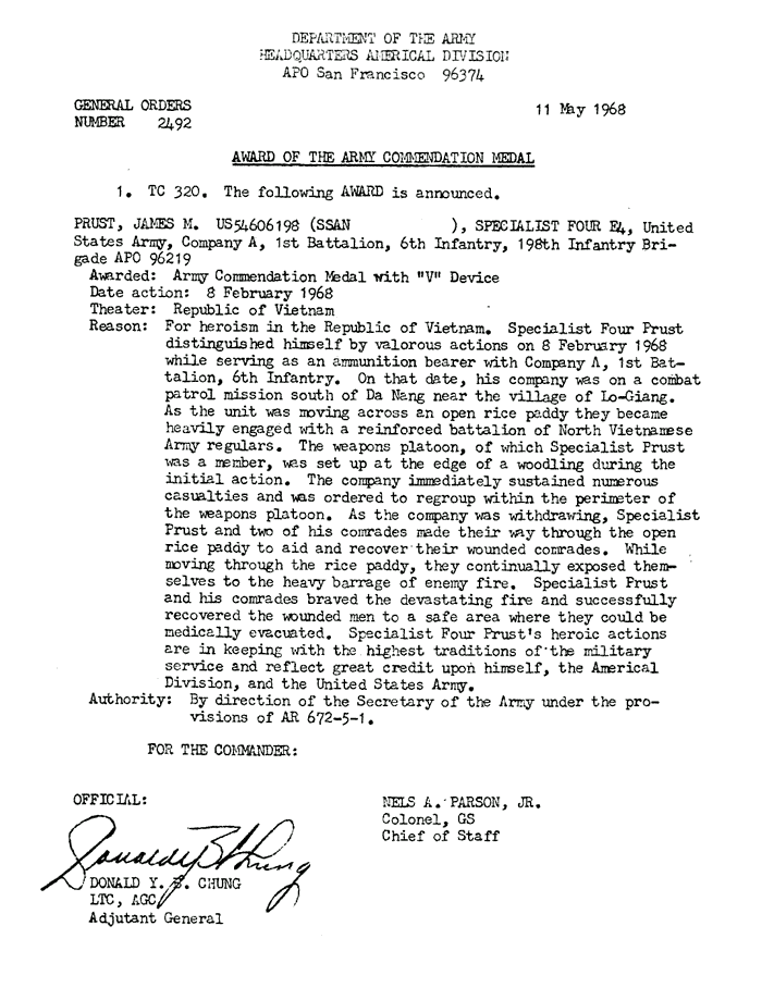 | Prust | James | M | SP4 | ACM w/V | A/1/6 | 8-Feb-68 | AD-68-2492 | |