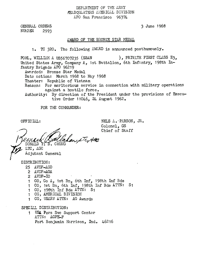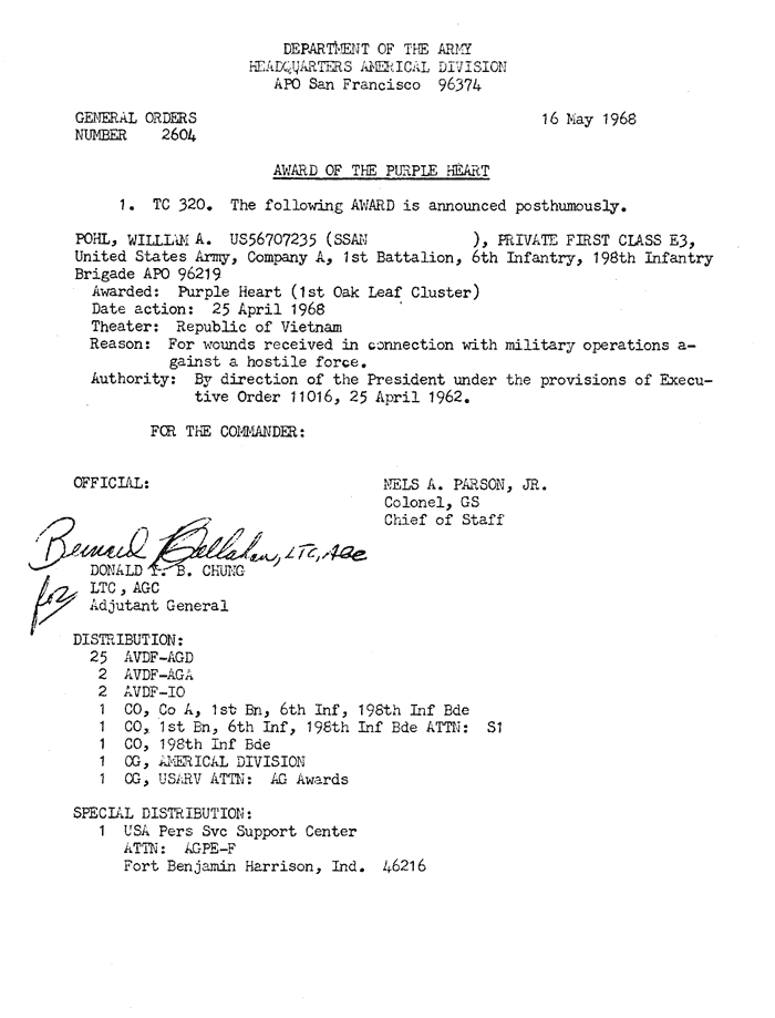 | Pohl | William | A | PFC | BS | A/1/6 | May-68 | AD-68-2993 | Posthumously |