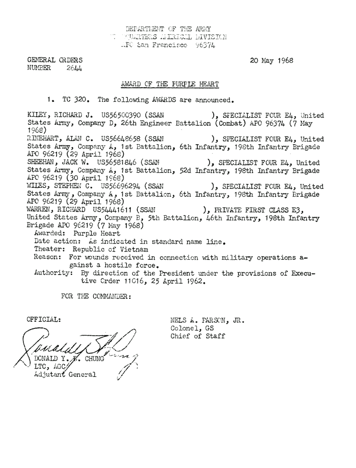 | Rinehart | Alan | C | SP4 | PH | A/1/6 | 29-Apr-68 | AD-68-2644 | |