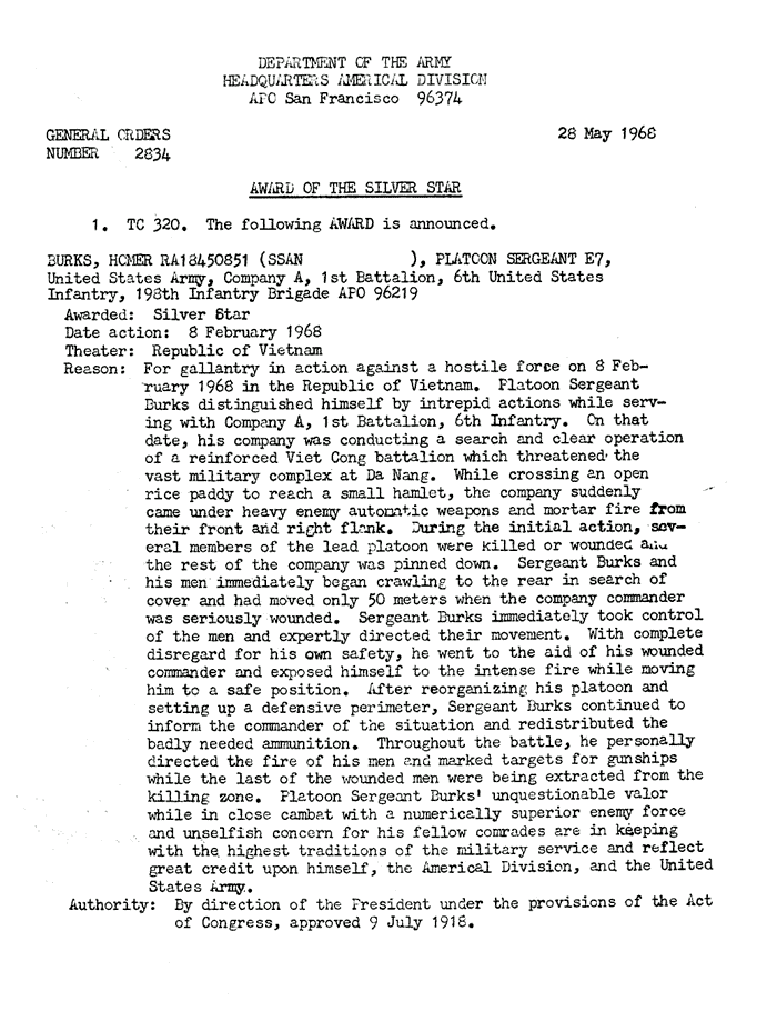 | Burks | Homer | SFC | BS w/V | A/1/6 | 1-Nov-67 | AD-68-0721 | ||