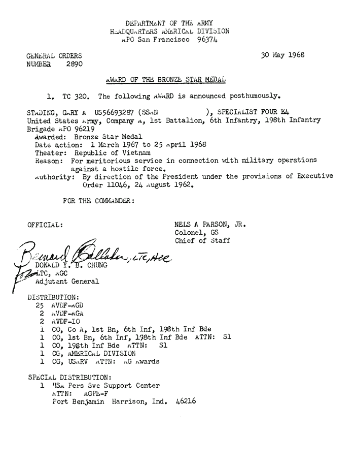 | Standing | Gary | A | SP4 | BS | A/1/6 | 25-Apr-68 | AD-68-2890 | Posthumously |