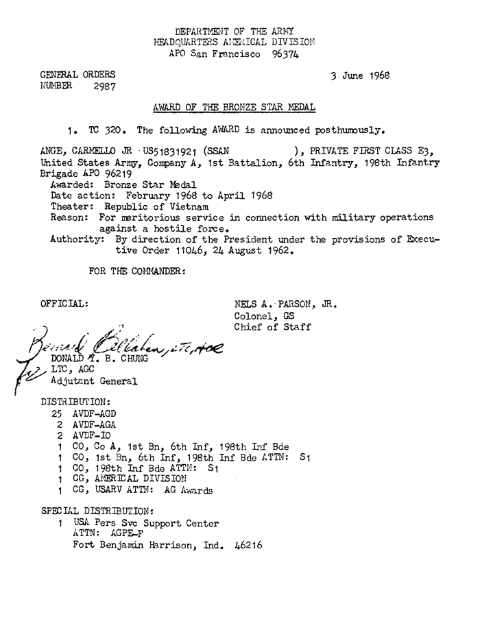 | Ange | Carmello | PFC | BS | A/1/6 | Apr-68 | AD-68-2987 | Posthumously | |