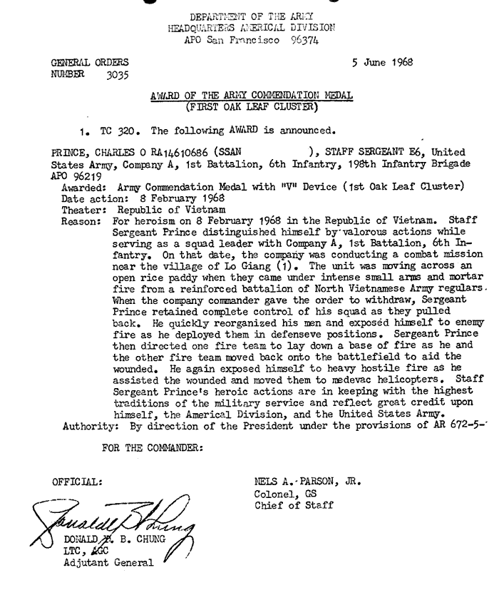 | Prince | Charles | O | SSG | ACM w/V 1OLC | A/1/6 | 8-Feb-68 | AD-68-3035 | |