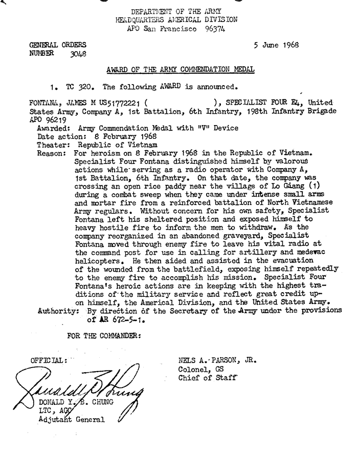 | Fontana | James | M | SP4 | ACM w/V 1OLC | A/1/6 | 8-Feb-68 | AD-68-3048 | |
