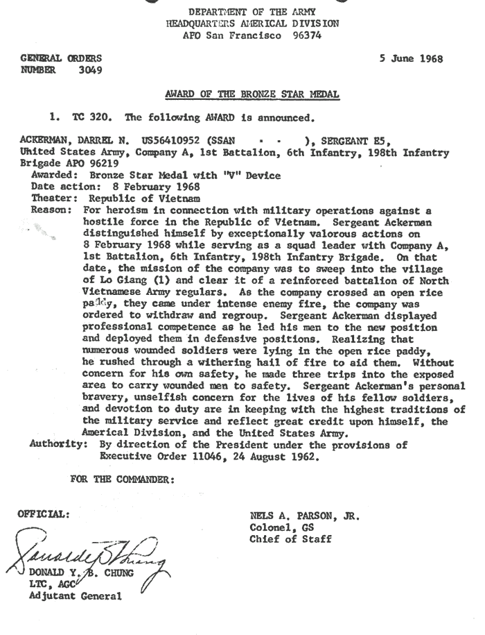 | Ackerman | Darrel | N | SGT | BS w/V | A/1/6 | 8-Feb-68 | AD-68-3049 | |