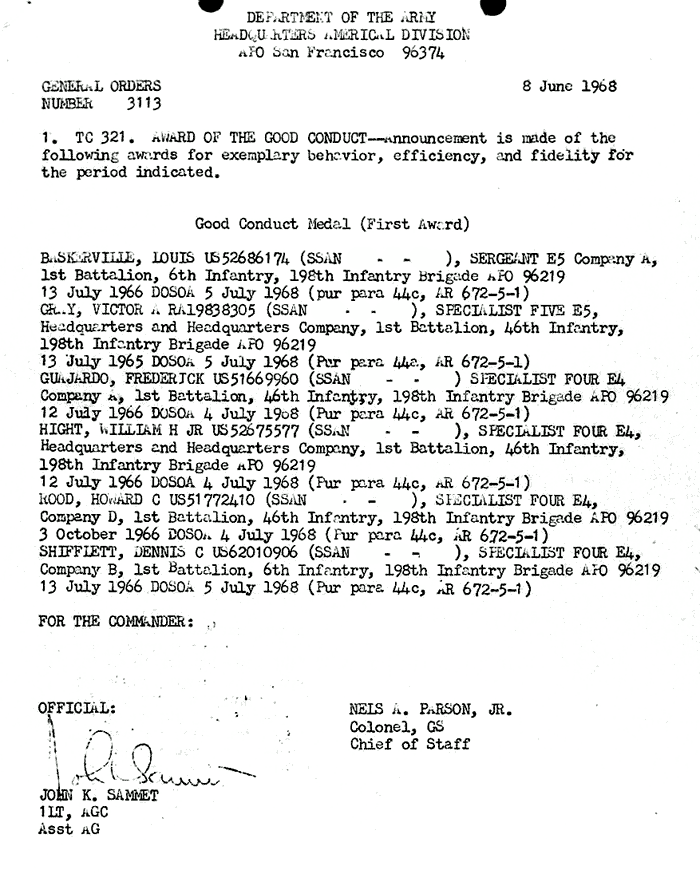 | Baskerville | Louis | SGT | GCM | A/1/6 | 5-Jul-68 | AD-68-3113 | 2 spellings of first name | |