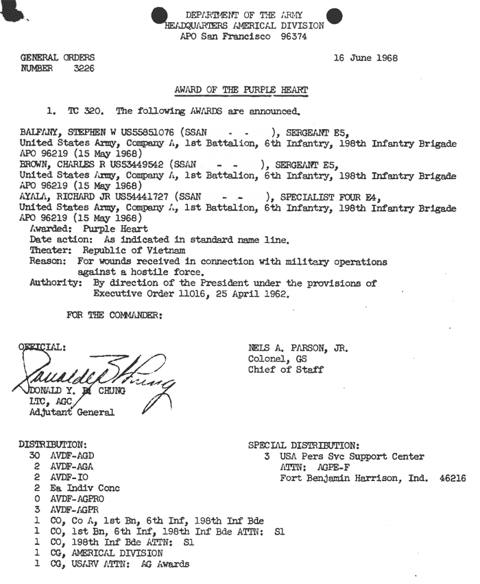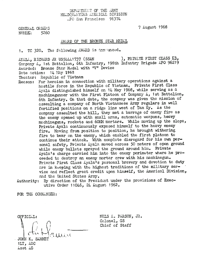 | Ayala | Richard | PFC | BS w/V | A/1/6 | 14-May-68 | AD-68-5260 | ||