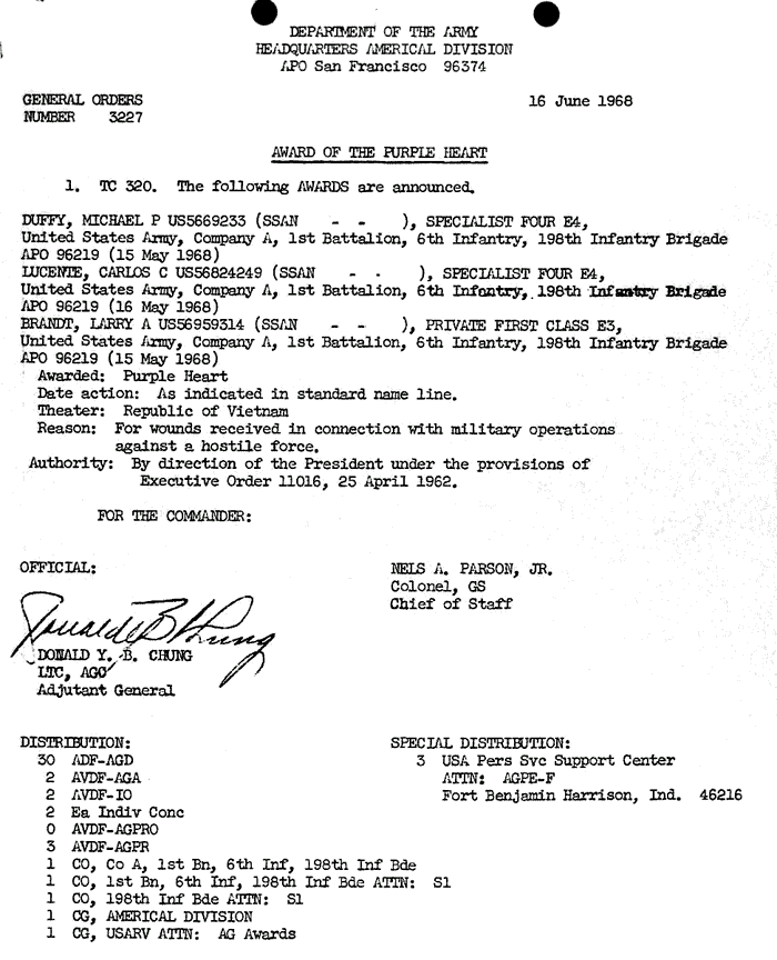 | Brandt | Larry | A | PFC | PH | A/1/6 | 15-May-68 | AD-68-3227 | |