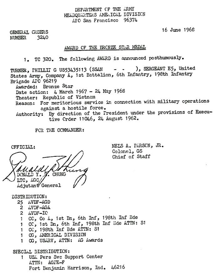| Turner | Jimmy | R | SP4 | ACM w/V | A/1/6 | 1-Nov-67 | AD-68-0473 | |