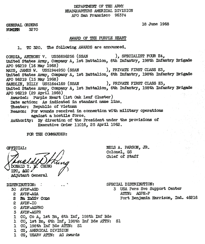 | Cordia | Anthony | V | SP4 | PH 1OLC | A/1/6 | 16-May-68 | AD-68-3270 | |