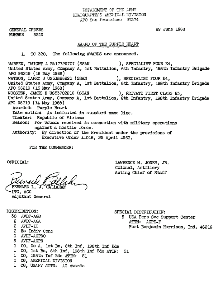 | Warren | Dwight | A | SP4 | PH | A/1/6 | 16-May-68 | AD-68-3519 | |