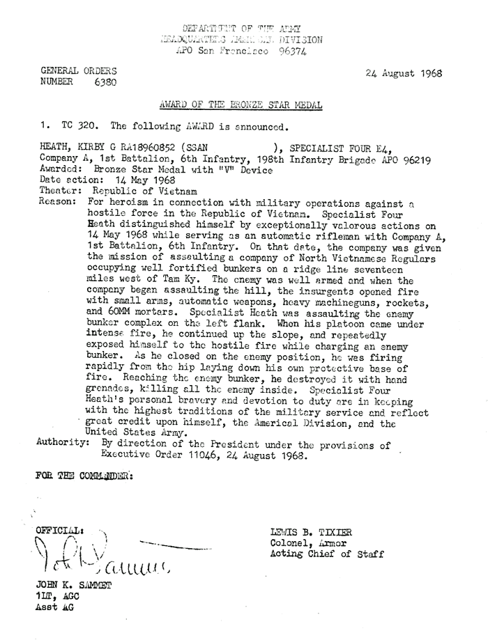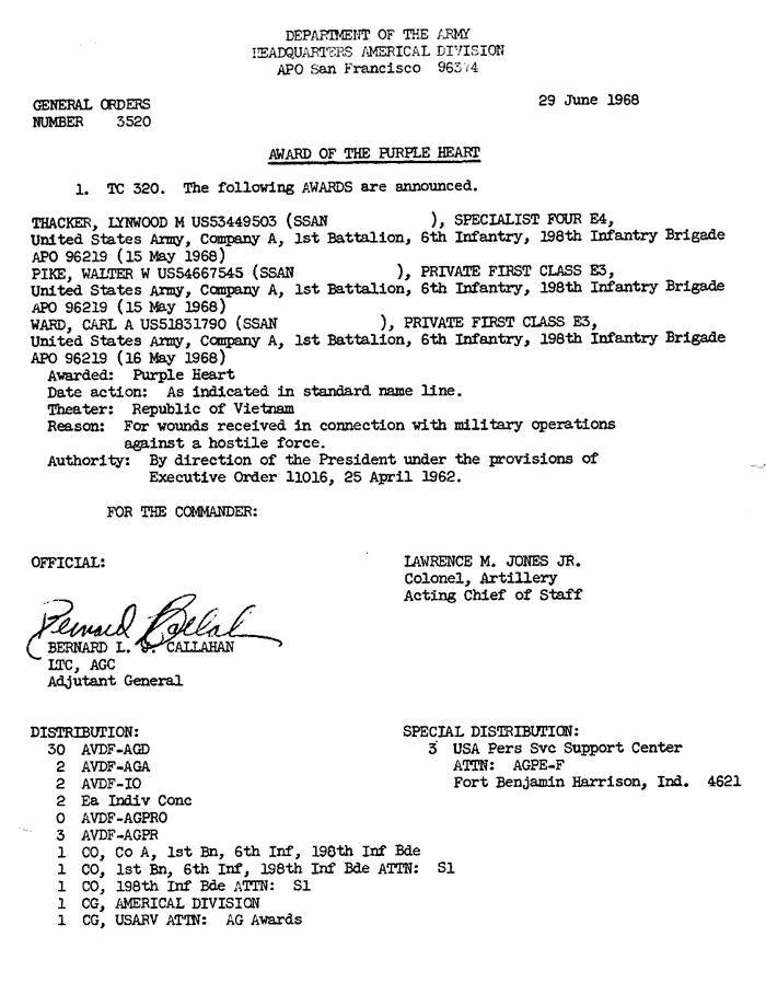 | Thacker | Lynwood | M | SP4 | ACM w/V | A/1/6 | 8-Feb-68 | AD-68-2518 | |