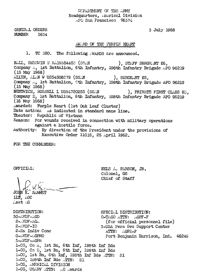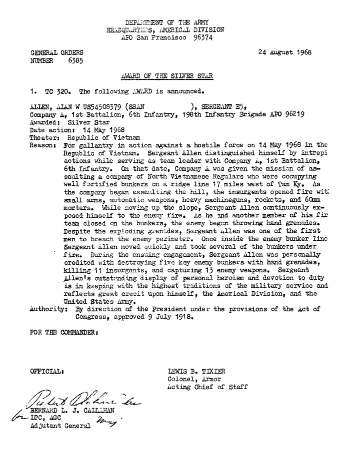 | Allen | Alan | W | SGT | SS | A/1/6 | 14-May-68 | AD-68-6385 | |