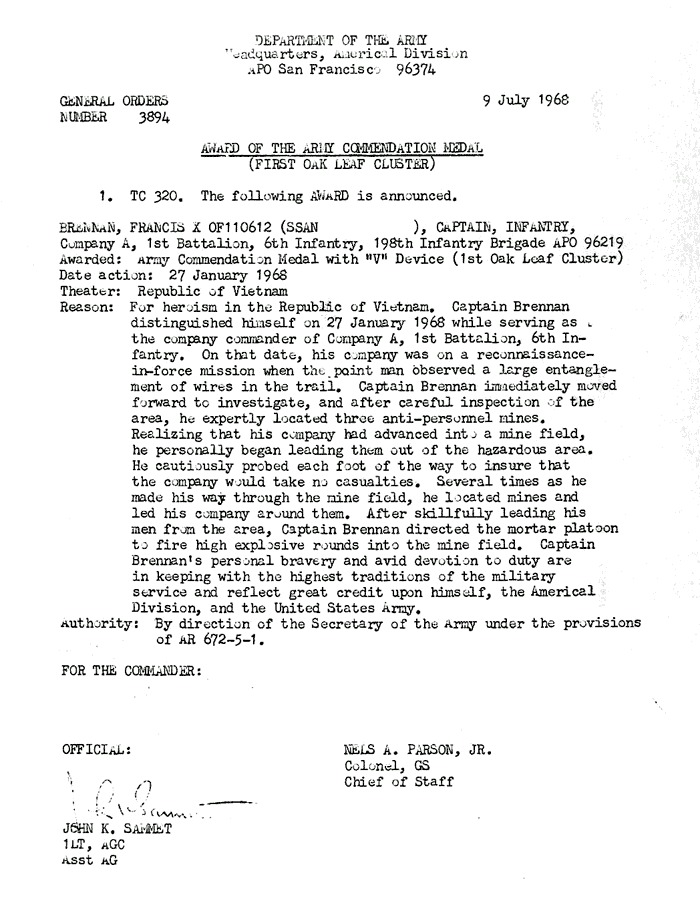 | Brennan | Francis | X | CPT | ACM w/V 1OLC | A/1/6 | 27-Jan-68 | AD-68-3894 | |