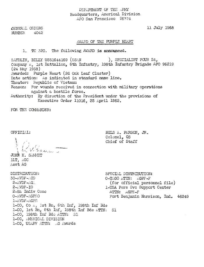 | Sandlin | Billy | SP4 | PH 2OLC | A/1/6 | 24-May-68 | AD-68-4042 | ||