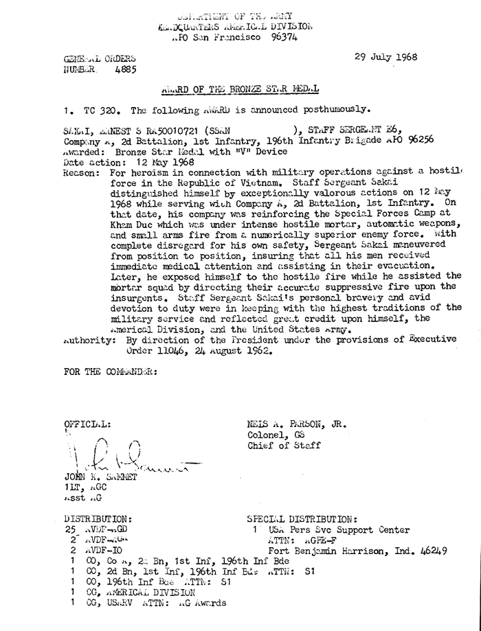 | Sakai | Ernest | S | SSG | BS w/V | A/1/6 | 12-May-68 | AD-68-4885 | Posthumously |