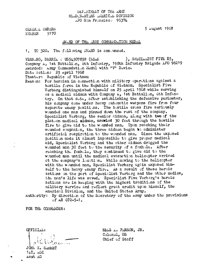 | Verbarg | Derril | W | SP5 | ACM w/V | A/1/6 | 25-Apr-68 | AD-68-5170 | |