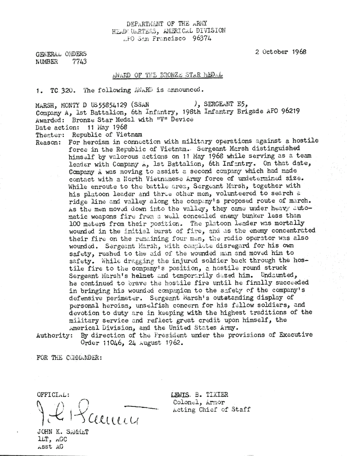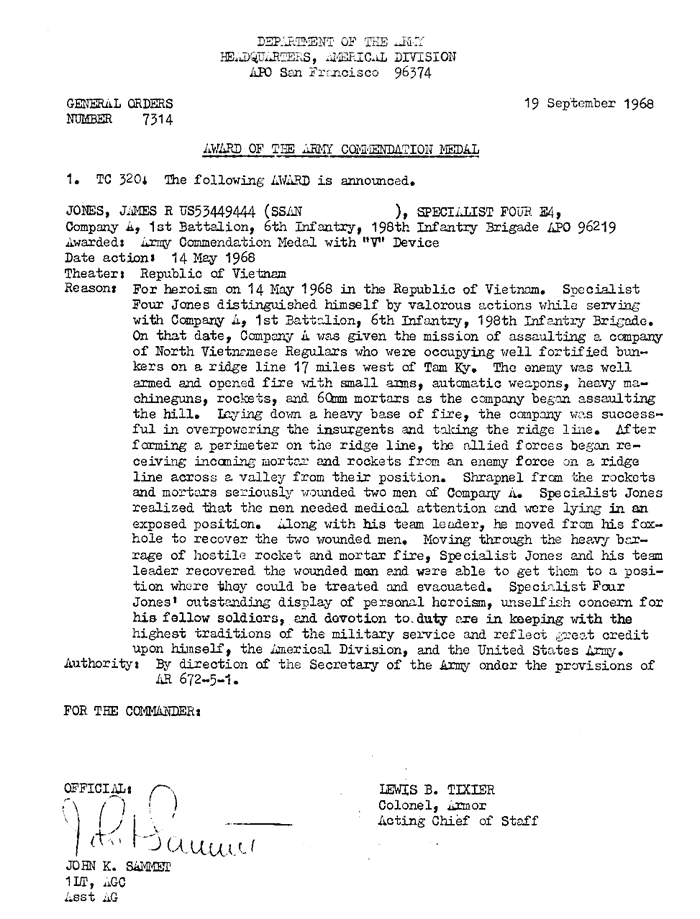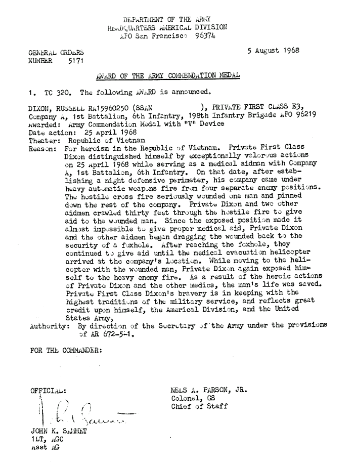 | Dixon | Russell | PFC | ACM w/V | A/1/6 | 25-Apr-68 | AD-68-5171 | ||