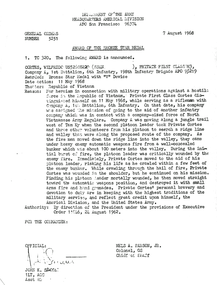 | Cortes | Wilfredo | PFC | BS w/V | A/1/6 | 11-May-68 | AD-68-5251 | ||