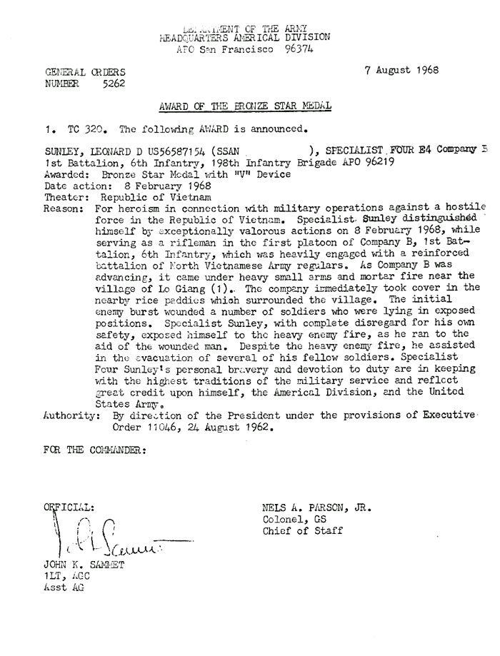 | Sunley | Leonard | D | SP4 | BS w/V | A/1/6 | 8-Feb-68 | AD-68-5262 | |