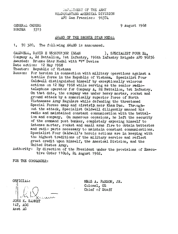 | Caldwell | David | E | SP4 | BS w/V | A/1/6 | 12-May-68 | AD-68-5315 | |